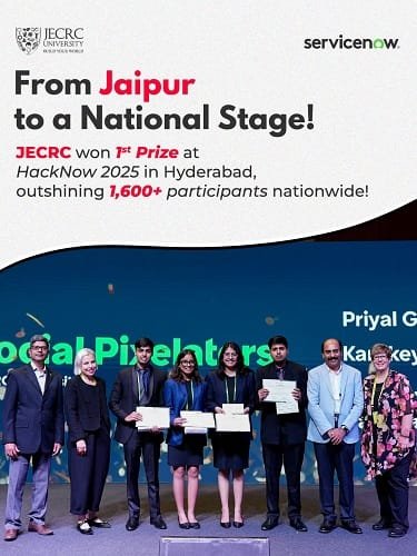 Breaking through a pool of over 1,600 top talents across India, JECRC’s dynamic team “Social Pixelators” has clinched the First Prize at the prestigious ServiceNow University HackNow – India 2025, organized under the ServiceNow AI Skills Summit with support from Deloitte.